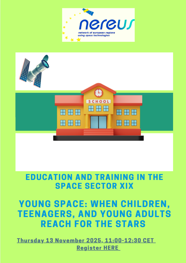 NEREUS organises on the 13 November 11.00-12.30 (Brussels time), the 19th edition on education and training in the space sector will focus on the next generation on how to inspire, engage, and empower children, teenagers, and young adults to pursue space-related careers. Through presentations and discussion, the session will explore how youth across Europe connect with space through student initiatives, competitions, and educational programmes. It will highlight concrete examples from regional and national strategies that actively support young people’s involvement in space, showcasing how regions can serve as enablers of innovation, curiosity, and long-term commitment to the space domain.