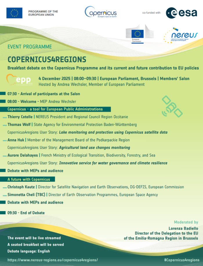 The “Copernicus4Regions Breakfast Debate” will be hosted by MEP Andrea WECHSLER, EPP Member of the European Parliament and co-organized by the European Commission, the European Space Agency and NEREUS on 4 December 2025 at the European Parliament. The event will feature a policy debate that highlights how Public administrations use Copernicus and benefit their territories, citizens and public policies.
